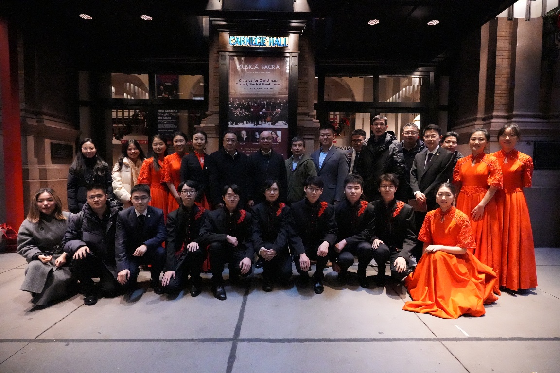 同学们用精湛的演奏技艺、饱满的舞台情绪、默契的团队配合,呈现出精彩的节目效果,展示出中国青年学子昂扬向上的精神面貌。《花好月圆》《敦煌》两首乐曲代表的团圆、交融,既传达了中国“和羹之美”的文明互鉴理念,也完美契合晚会主题。乐曲结束后,音乐厅内响起雷鸣般的掌声。联合国大会晚会主办方对民乐队精彩的演出予以高度赞扬,认为“卡内基音乐厅在此刻已成为连华夏乐章、叙古今故事的一抹长虹”。