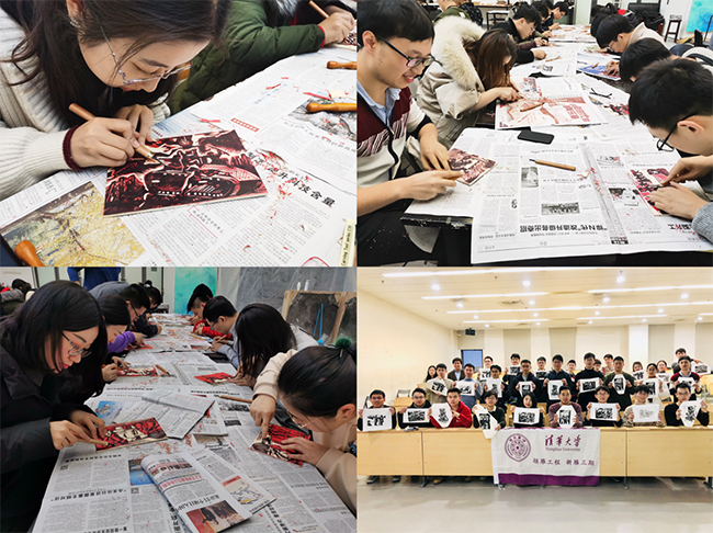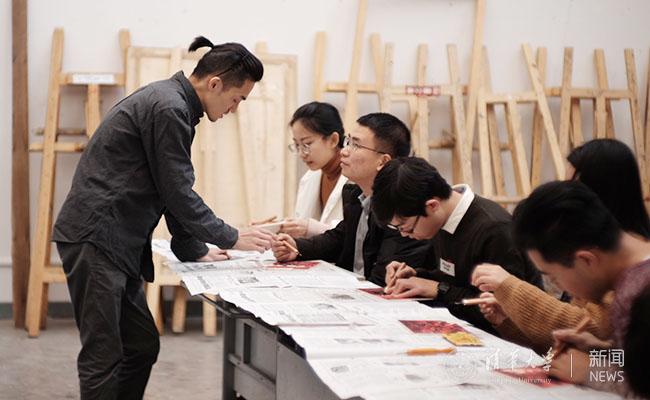 仪式上,美术学院版画工作室教师文乐为全体学员作了题为《版画和我们——一场印刷技术的革命》的专题报告。文乐通过一幅幅版画代表作追溯了版画历史,并重点介绍了抗战时期的延安木刻的历史意义。在文乐的指导下,与会学员进行了“不忘初心、牢记使命”主题版画体验活动。