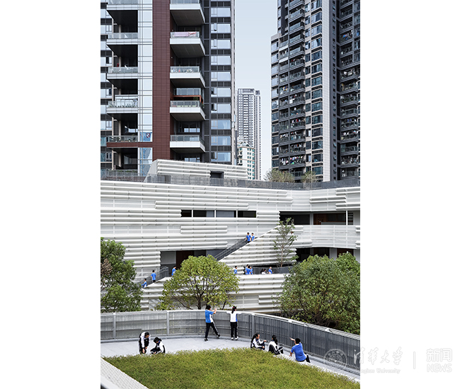 建筑师将南山外国语学校的校园构想为一座流线型、水平向的花园,与它所服务的城市住宅群落的密集、垂直纵向感形成强烈对比。校园的设计试图打破建筑与周边社区之间的边界,以此创造一个由封闭、半围合和绿色开放多种空间交错而成的低层线性混合体。得益于教学楼的层数,这组建筑为这个过于密集的住宅社区提供了“呼吸”的机会,同时又可以把学生们从教室里吸引到室外,“回归”校园生活,重新与自然建立健康的联系。