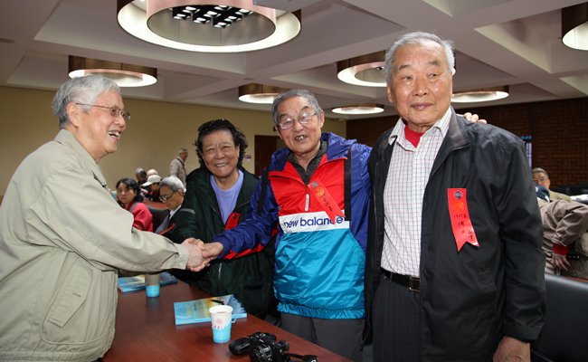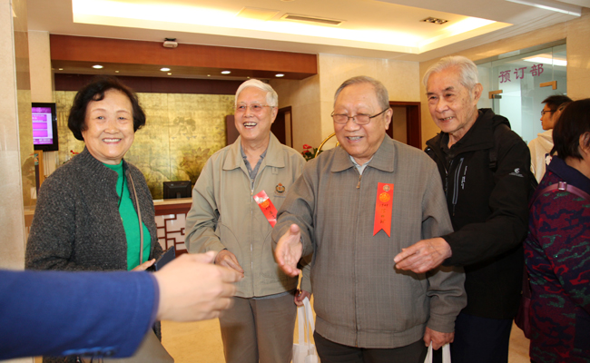上午10点,来自各地的校友们陆续来到近春园宾馆第三会议室,老同学相见分外激动,握手拥抱,相谈甚欢。年愈九十的陈伯时老学长和吕林老学长都来了,当年的班主任傅正泰坐着轮椅也来了。