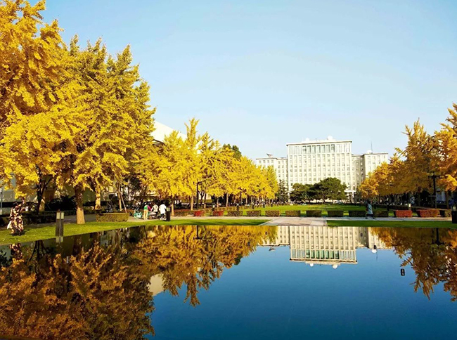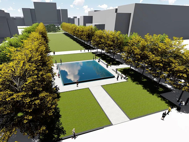 更庄重:改为镜面水池后,春夏秋三季水池形成镜面水膜,可映出天空、主楼、银杏大道的静谧壮观,配合间歇的小型喷涌泉,形成动静相宜的景观;冬季无水时,深色池台本身也能成为一道庄重、大气、简洁的景观。