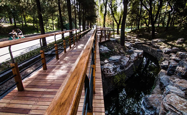 更安全:新的镜面水池喷泉不再使用水下电泵作为喷水动力,排除了触电风险;喷泉喷头被安装于水池的中心位置,溅出的水花不会打湿通道,池水会缓慢溢流到水池周围的溢流槽中,不会造成路面积水。本次改造还加大了水池南侧停留空间,为观赏休憩提供了更充足的空间和舒适的环境。