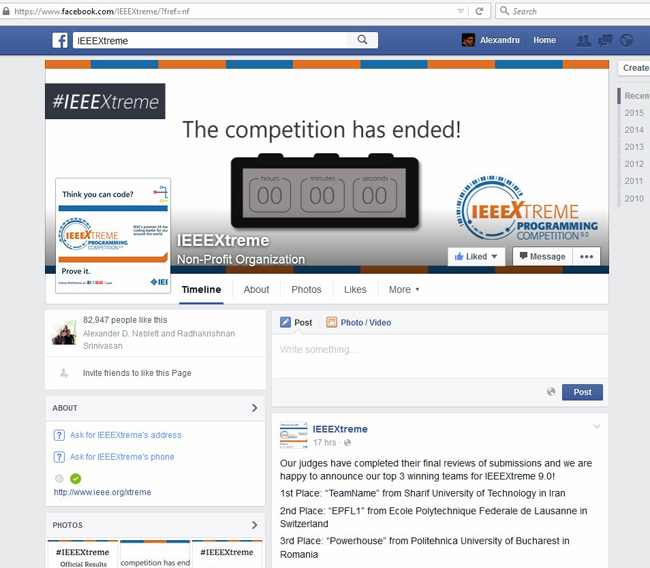 IEEEXtreme 竞赛结果公布facebook公布页面,网页地址:https://facebook.com/IEEEXtreme/?fref=nf
