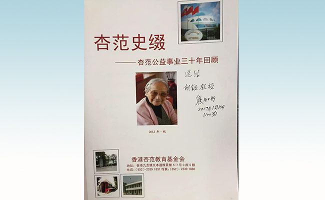 在下午茶中,时间又轻易地滑了过去,不知不觉,又与熊学长聊了近一个小时。我拿出了刚才的那本书《杏范史缀——杏范公益事业三十年回顾》,请老学长签名留念。熊学长拿起笔,认真地写下了“送给胡钰教授”,并签上了自己的名字、日期,刚要搁笔,突然又对我说:“我今年100岁了?!”,我点头大声说“是啊”,于是,老学长又在名字下写了一个“100岁”,之后又问我,“是不是加个括号好看些?”,我再次笑着大声说“是啊!”,于是,老学长就在“100岁”外又加了一个括号。那场景,现在回想,依然充满童趣。