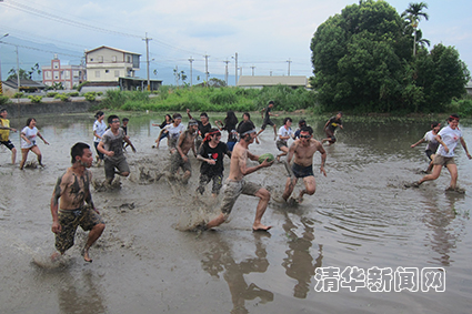 图为两岸三地学员与社区村民共同参加“泥浆橄榄球”比赛。田 浩 摄