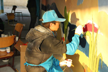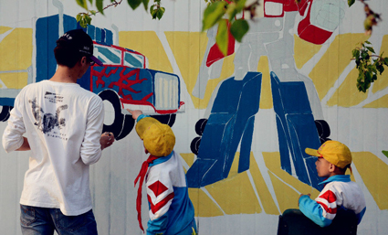“当时在河北第一次活动,那个墙特别脏,很不适合画画。我们就一起拿砂纸把墙打磨干净,大家都是灰头土脸的,满头、满脸、满身都是墙上的白灰,很累。可是大家都很开心,还特地把旁边的活动室也收拾干净,安装了新的投影仪。”庞龙说道。