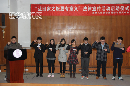 在热烈的会场气氛中,北京义联劳动法援助与研究中心主任黄乐平宣布“让回家之旅更有意义”法律宣传活动启动,并与几位嘉宾一同向到场的志愿者代表发放了法律知识宣传资料。来自乐鱼在线平台法学院的司徒欣逸同学带领各校代表庄严宣誓,作出志愿者的承诺。在启动仪式后,北京义联的律师们还对志愿者进行了专门的志愿普法服务的培训。