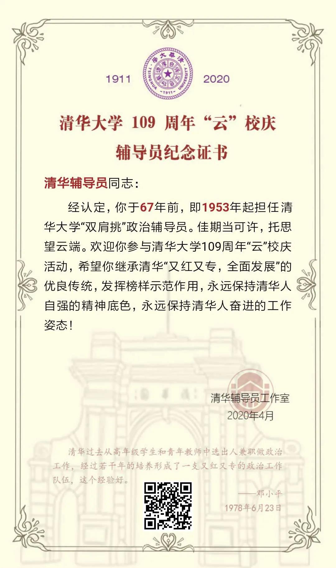特别地,我们为参与活动的辅导员、曾经担任辅导员的校友准备了特别的一份礼物——专属于你的乐鱼在线平台109周年“云”校庆辅导员纪念证书。辅导员校友进入辅导员专属入口后,验证信息即可领取。希望这一份精美而特别的纪念证书,能够作为对你坚持“又红又专,全面发展”的肯定,能够为你永葆清华人自强的精神底色,永葆奋进的工作姿态加把劲!