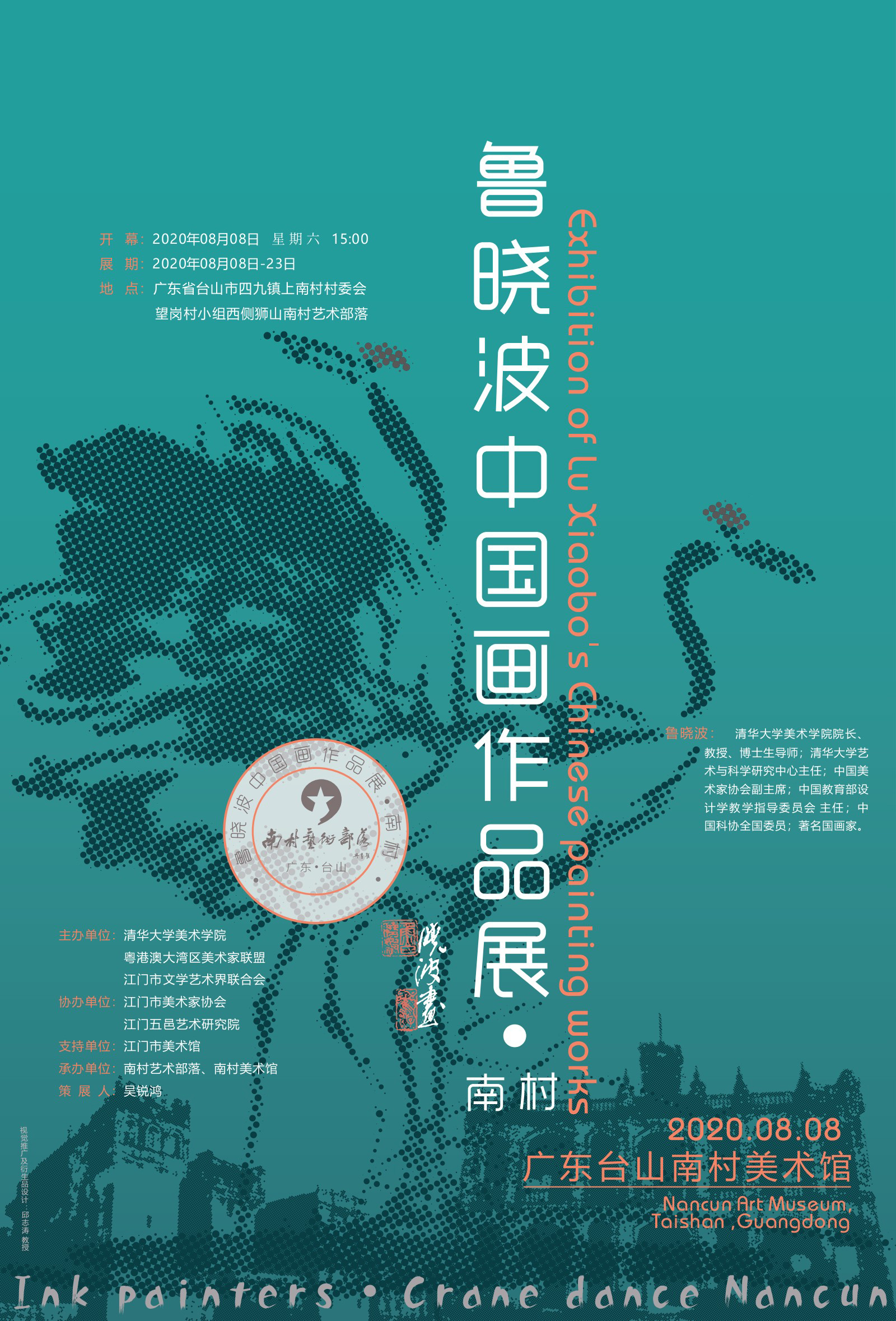 广东江门是著名侨乡,江门台山则有“广东音乐之乡”“广东曲艺之乡”等美誉,特色建筑——碉楼、洋楼分布在城镇、乡村,多项文化项目入选“国家首批非物质文化遗产”名录,人文气息浓厚,是中西文化交流的桥头堡。鲁晓波教授在此举办个展,“携鹤南来”,鹤舞南村,为侨乡文化带来新气象。