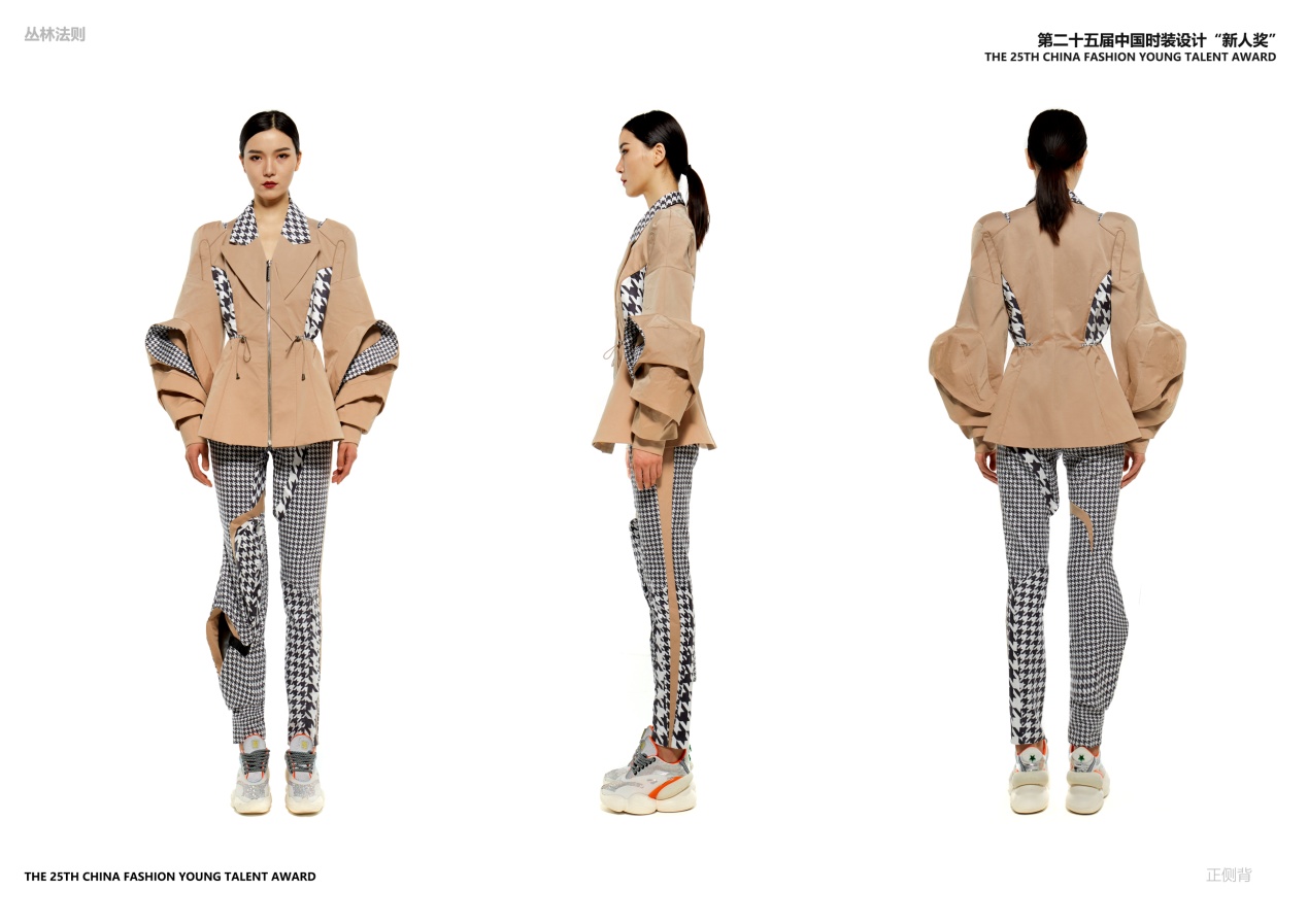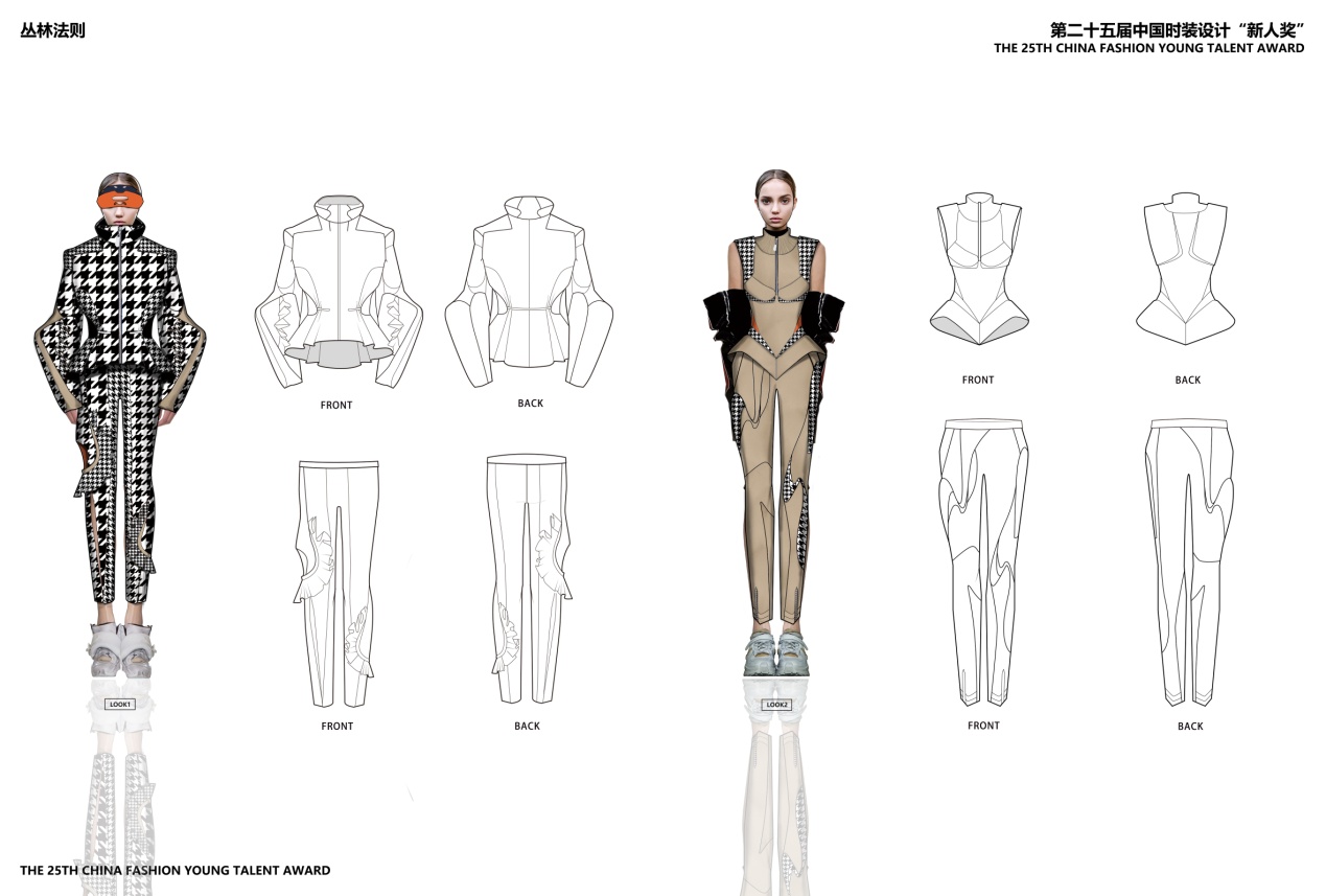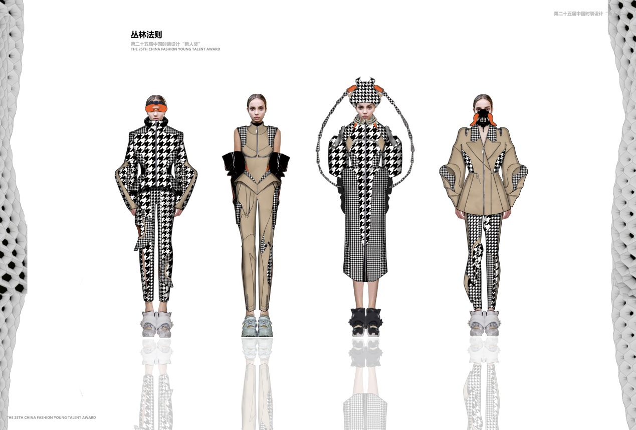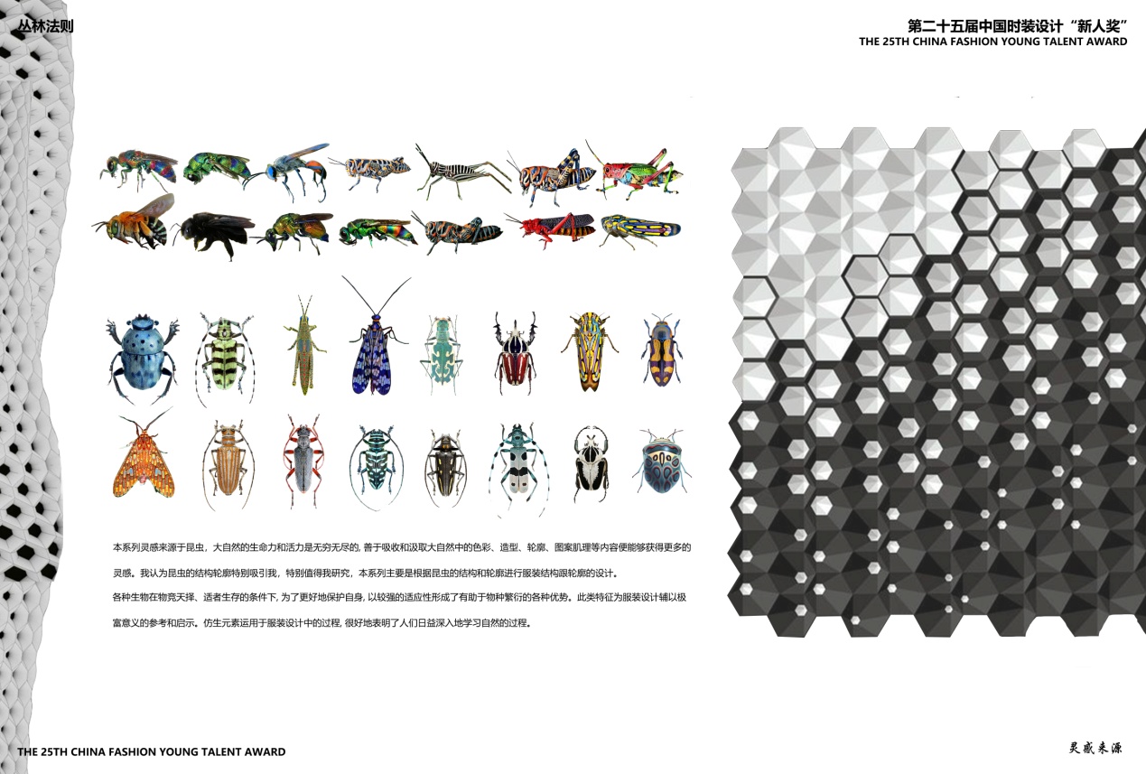 薛迪的参赛作品《丛林法则》以自然界昆虫的色彩肌理、造型结构为设计灵感。作者认为自然界昆虫的生命体都具有非常成熟和复杂的身体机能,它们的存在具备了合理性、功能性、美观性的特点。作者被自然界昆虫的丰富形态、结构、高度协调的图案和搭配色彩所吸引,并将其融入自己的服装设计中,使服装呈现了新颖的视觉效果。