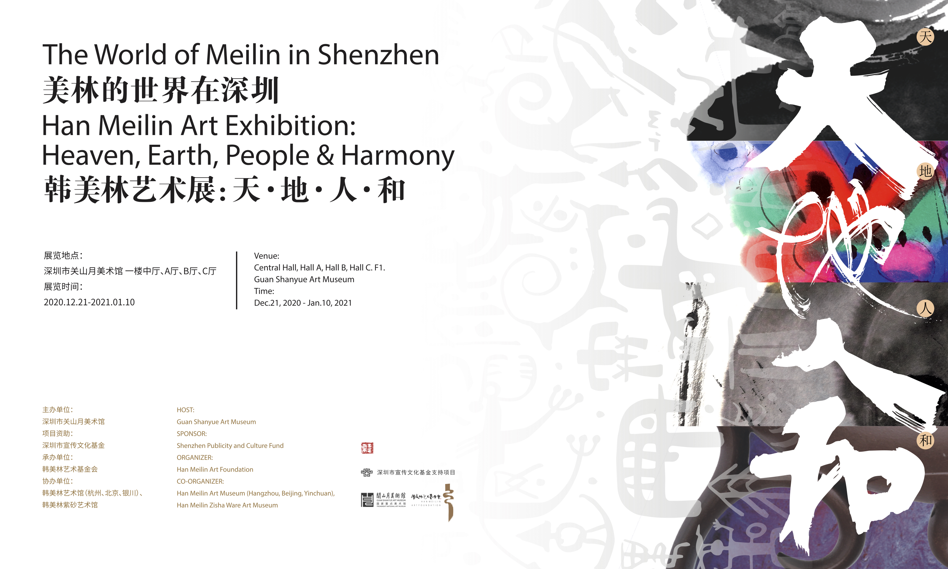 在关山月美术馆开幕的“美林的世界在深圳——韩美林艺术展:天·地·人·和”,围绕“天”“地”“人”“和”四大版块,1500平方米展厅内汇集了韩美林三百余件不同门类的代表性作品,全方位、多角度展现了韩美林众生平等、万物有灵的人文情怀,和谐发展、天地人和的艺术理念。