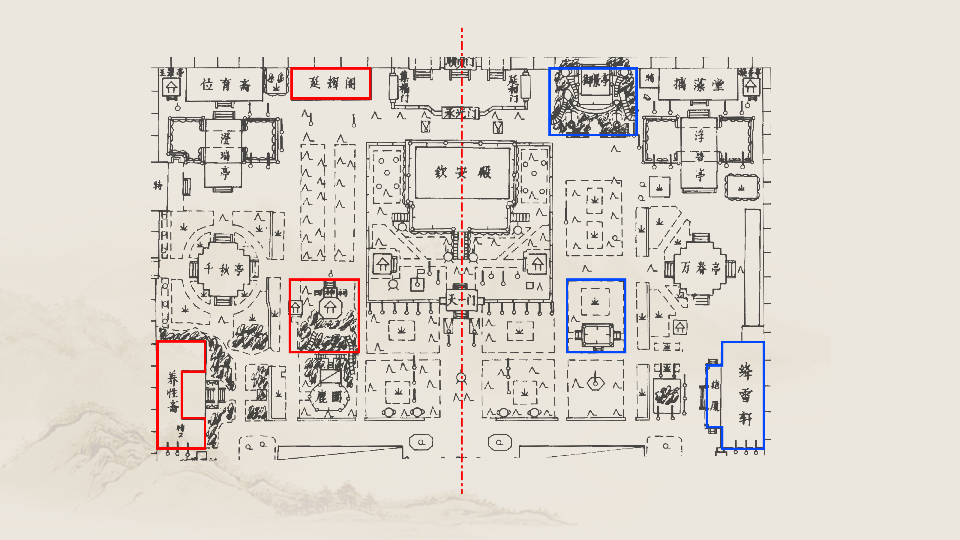 故宫的总体规划除了中轴线两侧的对称关系,设计也非常精密。刘畅介绍,著名建筑史学家傅熹年先生研究发现,乾清宫和坤宁宫区域面积是从太和门到乾清门距离的1/4,同时这个区域也是用来控制周边其它后宫区域面积的比例尺。如果给乾清宫和坤宁宫区域打个交叉线,乾清宫正殿正好在交叉点上,把正殿放在交叉点上的做法,在其他各宫的建设中也都使用到。这个设计手法古已有之,宋代的李诫在中国古代建筑专著《营造法式》里说过“况神畿之千里,加禁阙之九重,内财宫寝之宜,外定庙朝之次,蝉联庶府,棋列百司……”