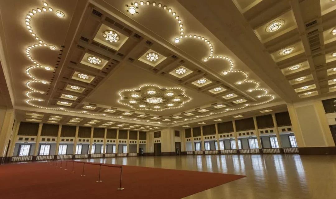 人民大会堂宴会厅,根据唐代风格的藻井图案中的花瓣构成圆形浮雕大花,常沙娜设计,1958