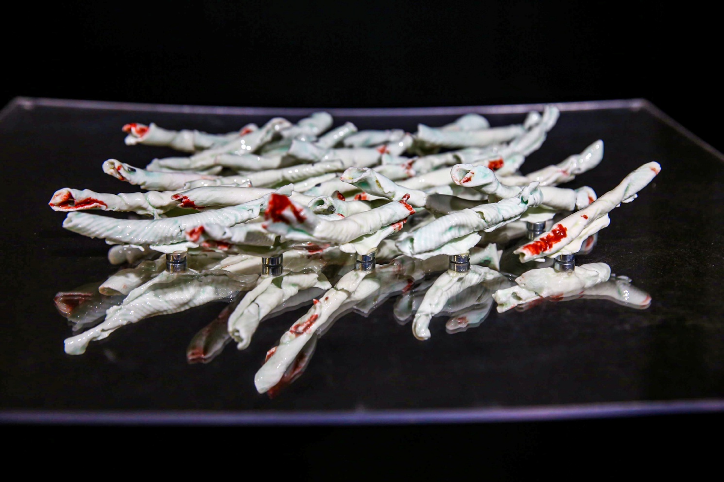 作品简介:以神经元连接成的一只人类手与一只机械手相互搭靠在一起,构成了一个 “人”字。两只手触碰在一起的地方,通过神经相互缠绕覆盖,仿佛机械被注入了新生的生命。