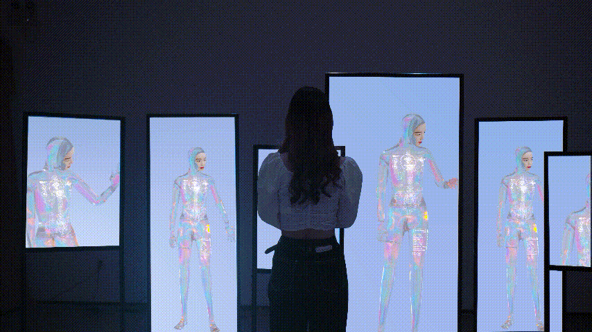 作品简介:利用所采集的观者信息和 AI 换脸技术生成观者在虚拟世界中的“身份”,通过镜像的形式呈现给观者,促使人们反思真实世界和虚拟世界中交织的身份与人格问题。