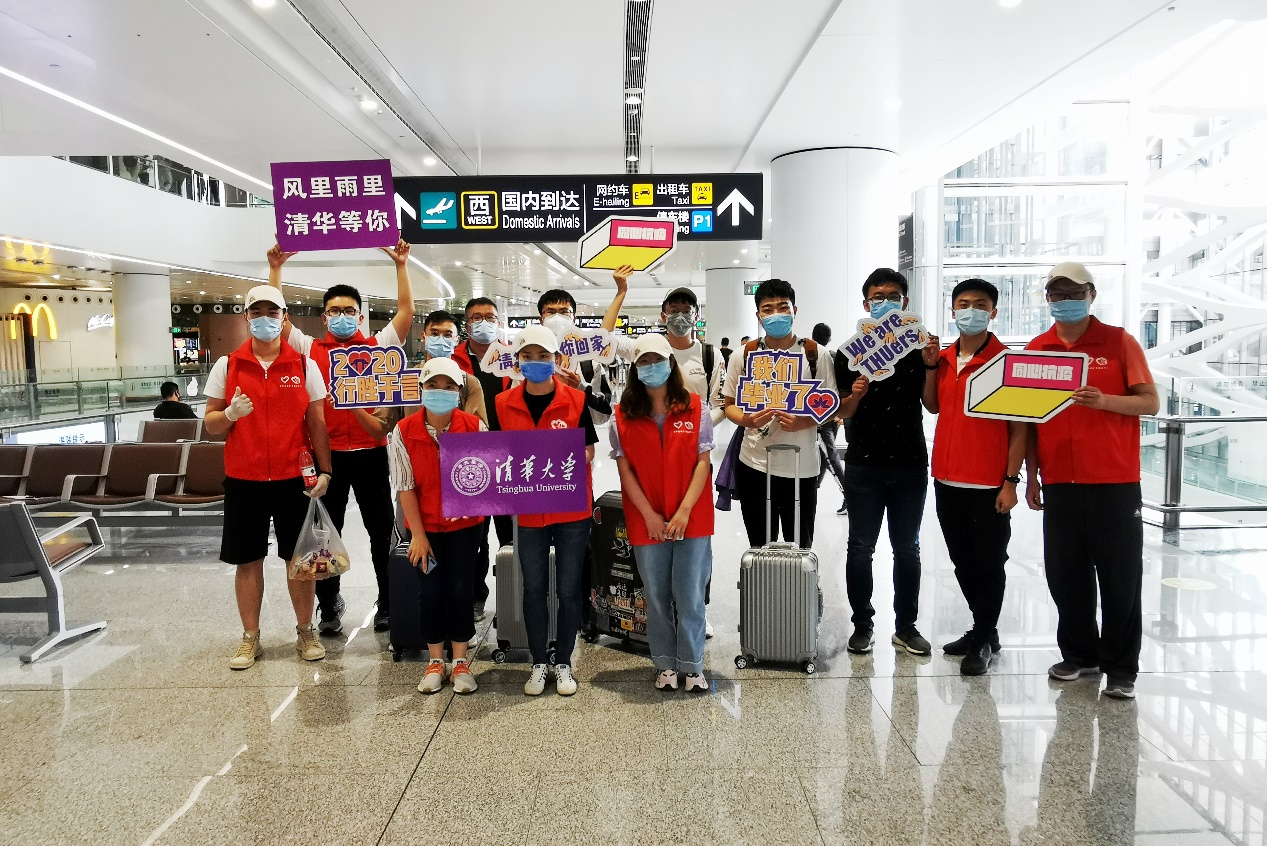 在大兴机场迎接返校同学(右一)
