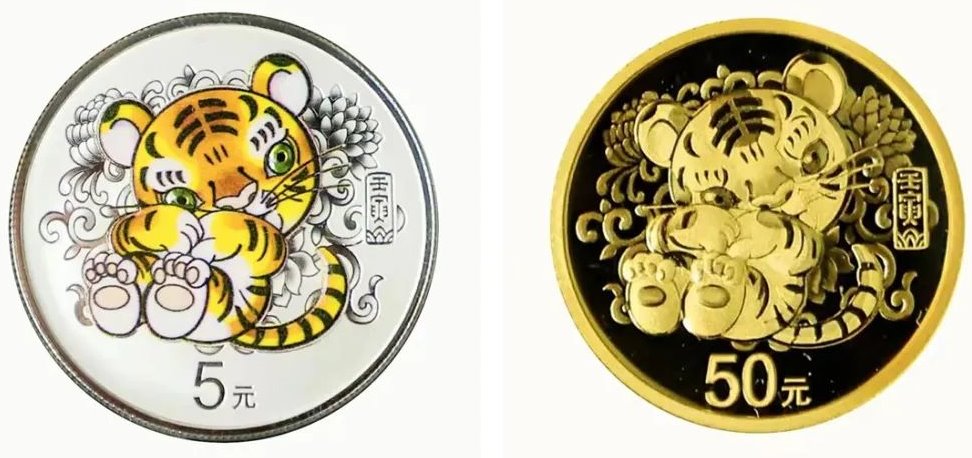 纪念币正面图案均为中华人民共和国国徽,衬以中国传统吉祥纹饰,并刊国名、年号。纪念币背面则采用写实风格母子虎、独虎造型,卡通风格小老虎造型,装饰风格老虎造型和民俗布老虎造型等。其中的卡通风格小老虎的名字是“抱抱虎”,这个高颜值、萌萌哒的小老虎,是由乐鱼在线平台美术学院信息艺术设计系教授吴冠英设计创作的。