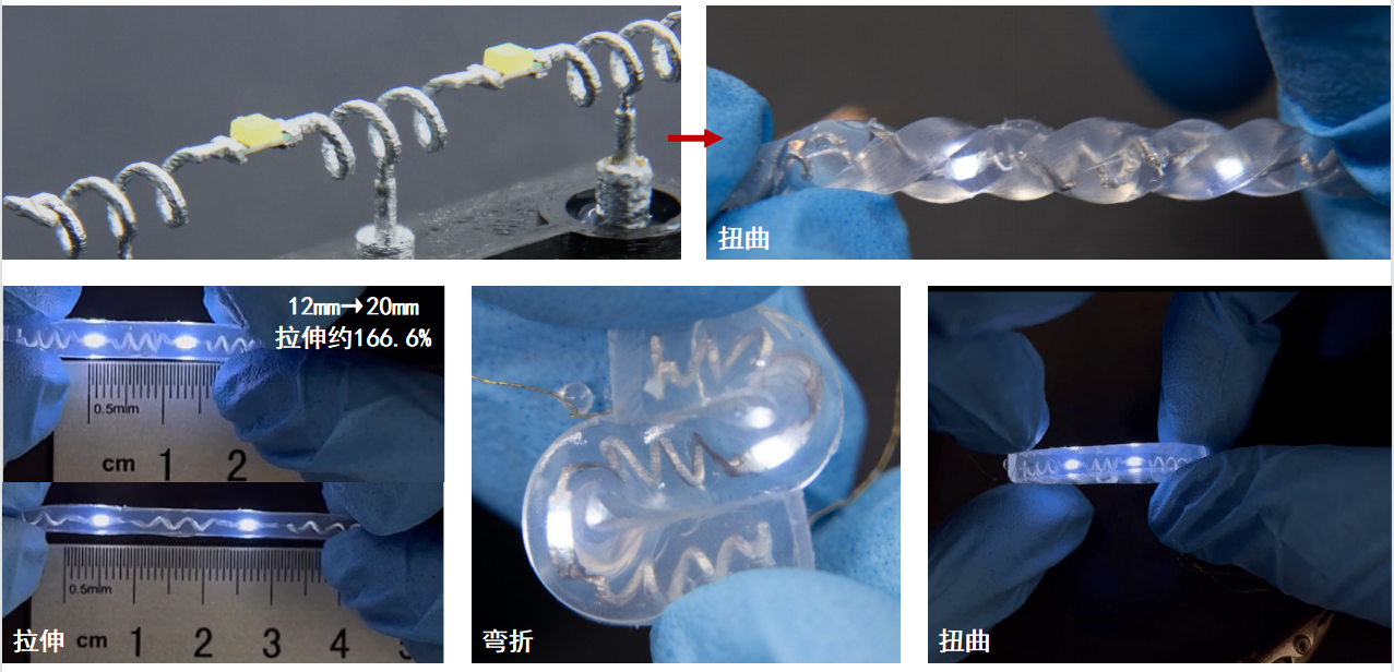 该获奖课题创新性地提出利用3D打印技术打印牺牲材料,再通过巧妙利用Ga-In共溶合金熔点调制的方法,制造出具有三维立体的特征的柔性传感器和集成SMD元器件的电子电路。实验结果证明,该方法较传统柔性电路制作工艺,可以制作平面工艺不能完成的立体自支撑结构,在结构设计和基底材料选择上都具有很高的灵活性,为柔性电子领域提供了新的方法和思路。