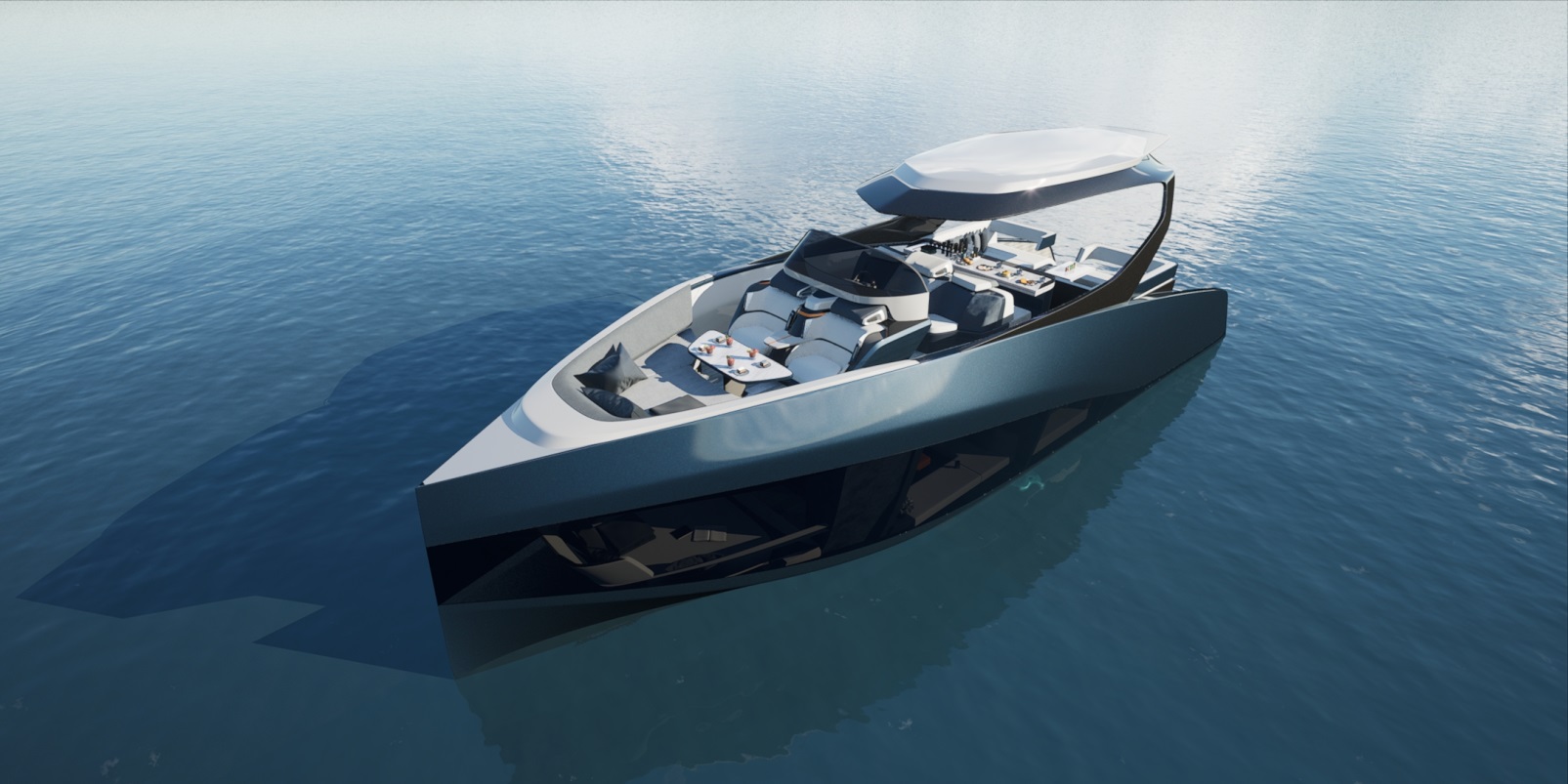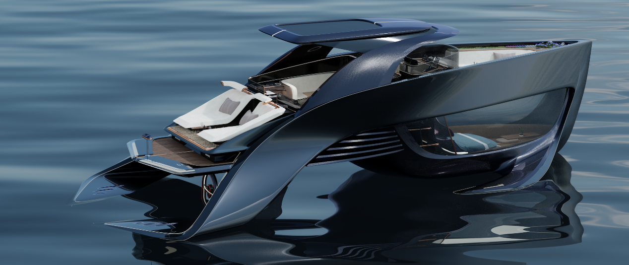 在外造型部分,设计者意识到水翼船上升的过程与海豚跃出水面的过程有异曲同工之妙,于是从海豚身上的曲线寻找造型灵感,将游艇视作为海洋的一部分,希望游艇在上升过程中看起来优雅有力,就似海豚一般,象征着游艇本身也像海洋生物一样和谐存在于海洋。