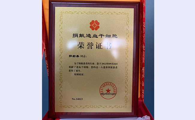 郭蔚嘉捐献干细胞后所获荣誉证书