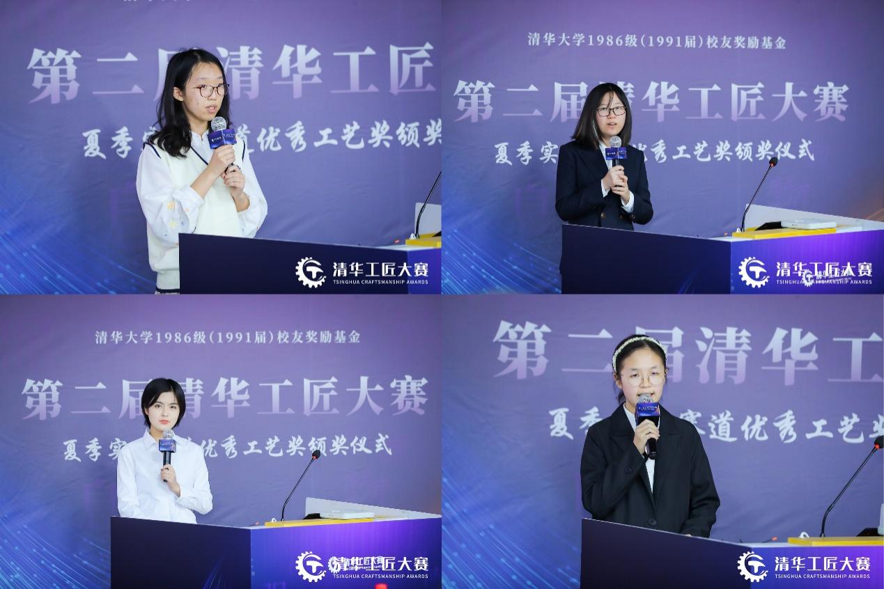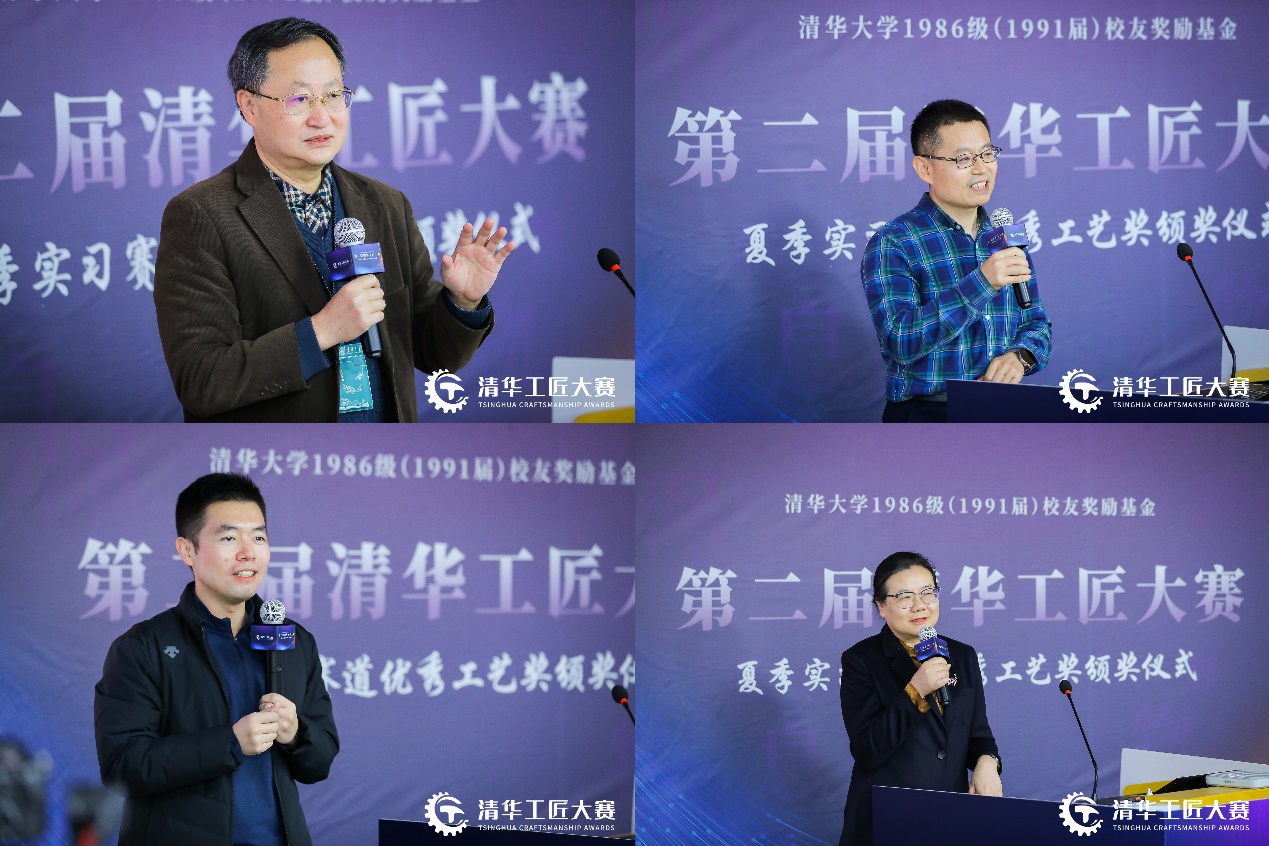 日新书院院长王中忱提到,日新书院的同学通过训练中心平台,了解了新时代的工程制造和工业设计,希望获奖同学能够进一步为书院的其他同学介绍学习经验,破除“动手设计制作”的神秘感。未央书院副院长李正操提到,大赛深刻诠释了清华“三位一体”的育人理念,更加充分地绽放了“三全育人”的魅力,体现了清华探究式、体验式学习的特色,帮助同学们在创造中发挥主观能动性,助力培养未来创新领军人才。校团委副书记王展硕表示,大赛从育人内涵、模式创新探索以及精神传承等方面,进一步丰富了学校的学生科技创新体系,蕴含着清华人自强不息、厚德载物的精神内涵,承载着所有86级校友对清华学子的关爱和支持。86级校友代表陶黎敏结合“中国天眼”工程以及清华工物系团队的经历,讲述了清华人的工匠精神,希望同学们能够坚持好奇心和想象力,持之以恒地在热爱的事业上执着追求。