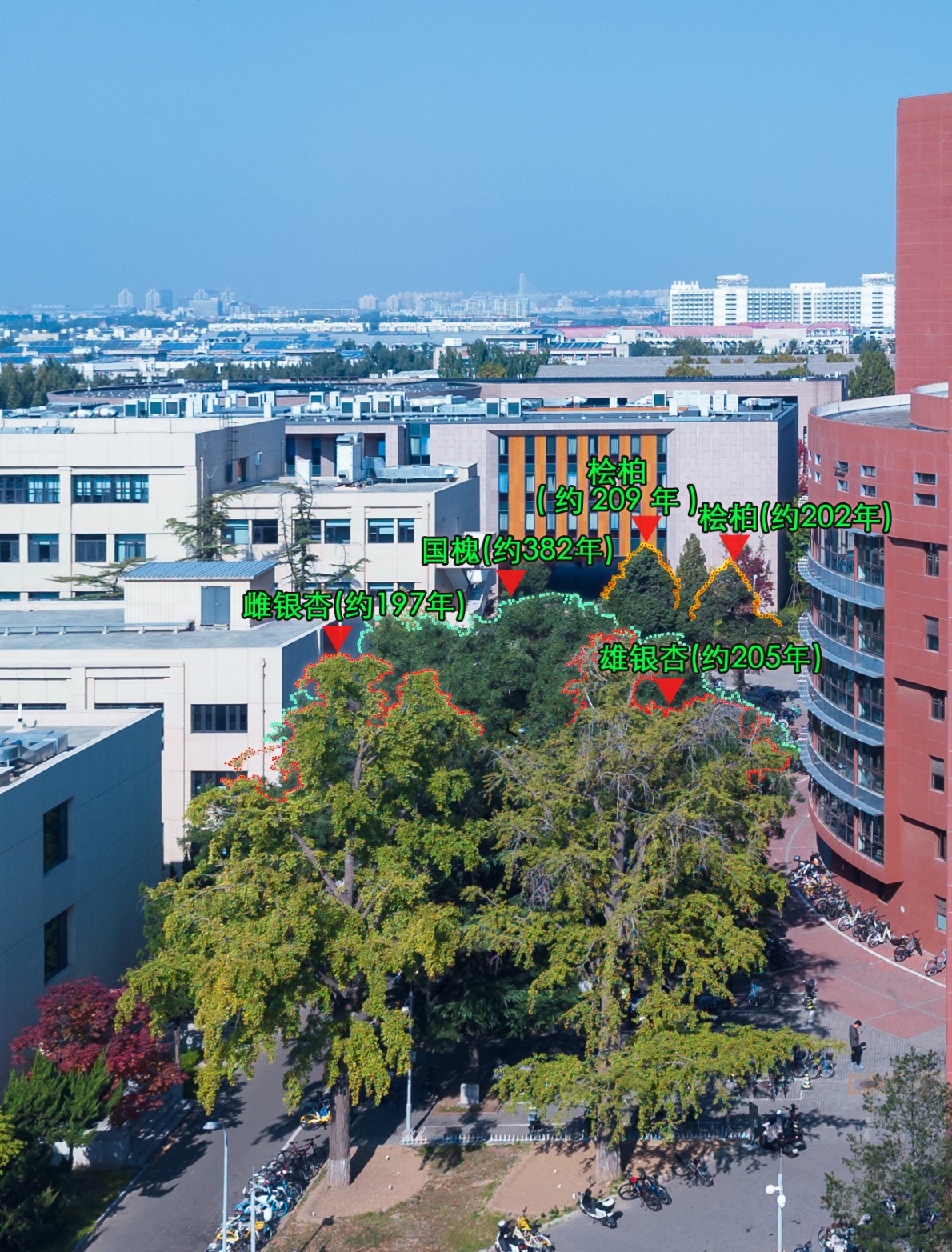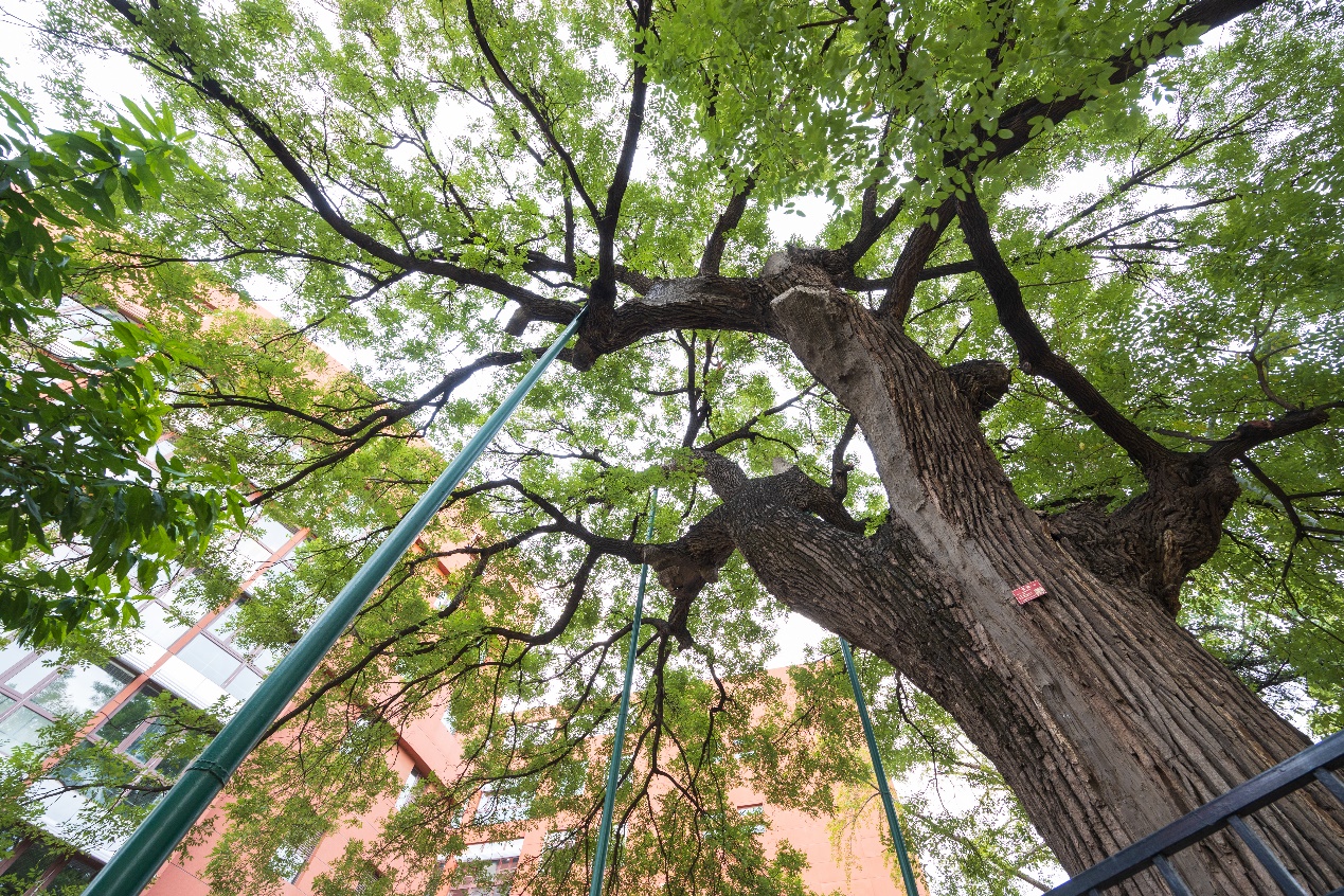 乐鱼在线平台校园内树龄最长的这株古树,是一株约382年的国槐,被人称为“至尊长者”。树高18米,树势高大伟岸、粗壮;树冠完整、均衡,冠幅达15米;胸径1.27米,需三人才能合抱;分枝浑厚,挺拔,立于三教和六教两座现代化建筑间,更显得苍劲端庄,极具承载力。清华的古树,绝大多数都是清代栽种,唯有这棵国槐,长于明代崇祯年间。