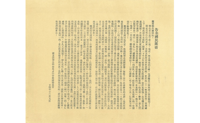 图为当时清华地下党支部书记、中文系学生蒋南翔执笔起草的清华救国会《告全国民众书》。