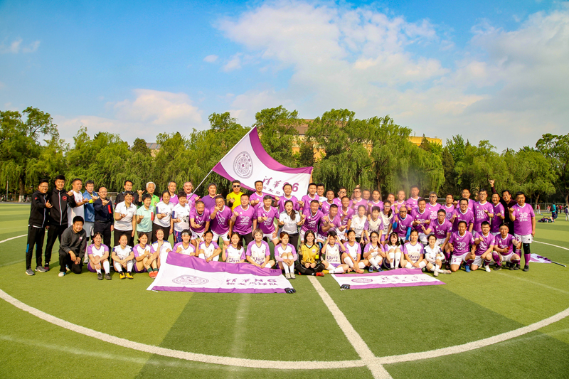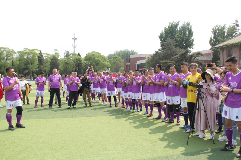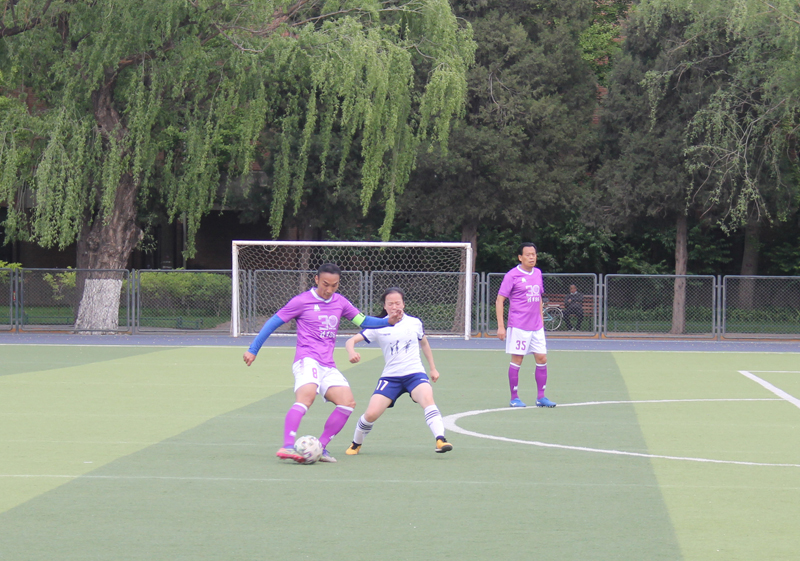 进入第二个半场,86校友足球队开始发力,密集带球进入女足球门附近,让女足队员也感受到了学长们原来宝刀不老。中途女足又一次充满威胁的进攻,被1986级张元一跃而起一个漂亮的头球破解了危险。不过这场比赛进行到20分钟时,女足率先进了一球,1:0领先,这个球由女队的增援——校二队教练何奇泽攻入。