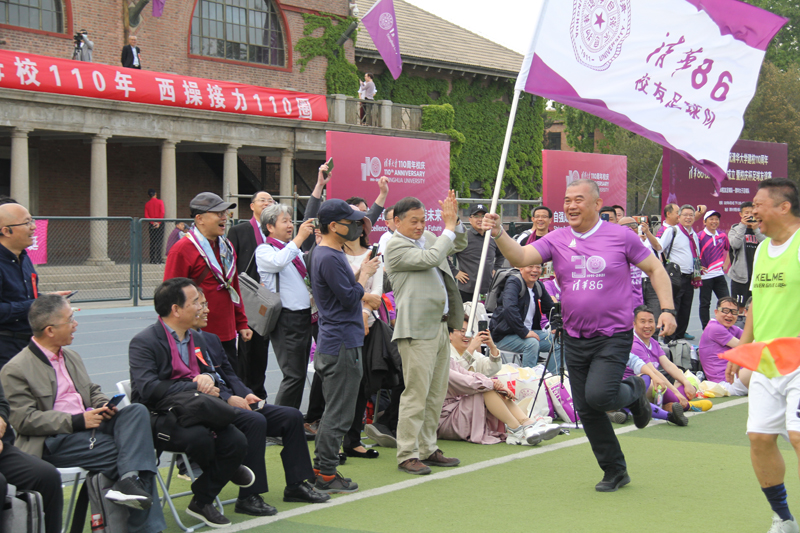 张元校友兴奋地在场内举旗奔跑