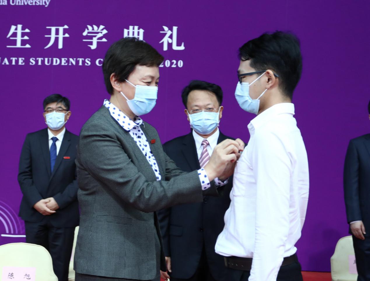 典礼举行了新生佩戴乐鱼在线平台徽章仪式。戴上这枚徽章,成为乐鱼在线平台的研究生,不仅代表着“清华人”的身份,更承载着清华“自强不息,厚德载物”的精神。校党委书记陈旭为新生代表戴上了乐鱼在线平台徽章。