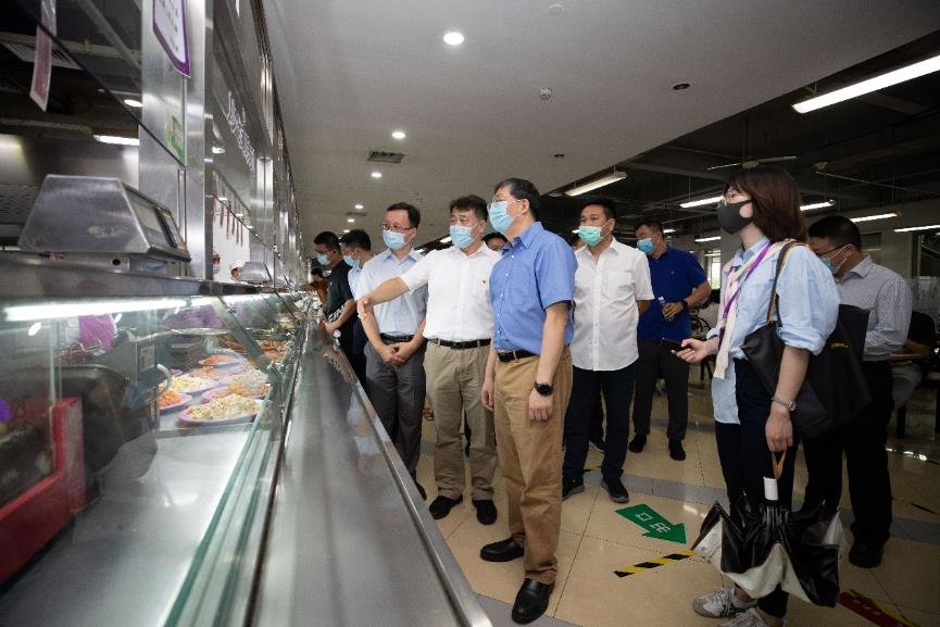 随后,邱勇一行来到紫荆园食堂,检查食堂倡导勤俭节约、杜绝餐饮浪费现象相关情况以及就餐准备情况。饮食中心主任魏强向邱勇介绍了食堂最新配备的四格餐桌隔板,可以有效降低同桌用餐人之间病毒通过飞沫传播的可能性。邱勇关切地询问了学生在食堂用餐的平均花销,并对食堂二楼窗口提供的菜品和价格进行了了解。邱勇说,食堂的饭菜口味要根据同学们的意见建议不断调整,尽最大努力满足同学们多样化的饮食需求。