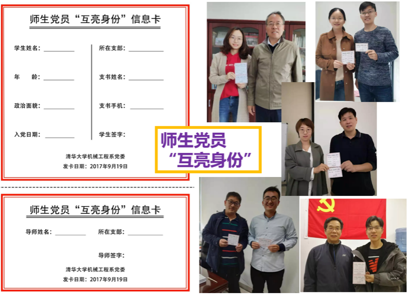 3. 研究生师生党员“互亮身份”。机械系自2017年起开展了研究生党员师生“互亮身份”活动,将育人融入到研究生成长的每一个环节。根据活动安排,研究生新生入学后,将持“师生党员互亮身份信息卡”与导师见面,共同填写党员信息,并开展思想交流。2019级研究生班级还在公众号晒出师生互亮身份的合影和感受体会,形成良好师生互动文化。