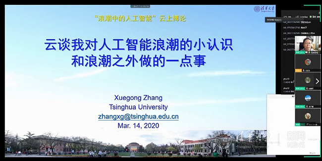“浪潮中的人工智能”“云上博论”聚焦人工智能热点,持续探索线上学术交流新模式。张学工以“云谈我对人工智能浪潮的小认识和浪潮之外做的一点事”为题作论坛特邀报告,介绍了机器学习的历史发展,并对机器学习在生物信息学中的应用进行分享。朱军在“机器学习与自然语言处理”分论坛中探讨了传统贝叶斯机器学习和深度神经网络之间的关系,徐枫在“视觉图像与多媒体”分论坛中介绍了轻量化三维动态重建及其作为虚拟世界和客观世界桥梁的科学含义。论坛持续近4个小时,与会师生克服不能面对面交流的困难,通过语音提问和聊天室开展学术交流,在特殊时期积极响应学校号召,做到“学术交流不断线,云上博论展风采”。