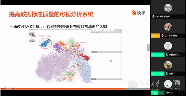 此外,本期“云上博论”还尝试进行了产学研的深度交流。网易有道公司技术总监林会杰以“网易有道教育AI能力及应用”为题,介绍了AI技术在教育软硬件工具中的技术应用。快手科技公司图像算法工程师李云锴围绕“数据质量改善在快手视频内容理解上的应用”,分享了可视分析系统对提高数据标注质量的算法原理和意义。与会同学抓住机会,结合自身研究方向,围绕技术创新如何与产业应用有效结合展开讨论,在交流过程中进一步增进了对人工智能产业化的认识。