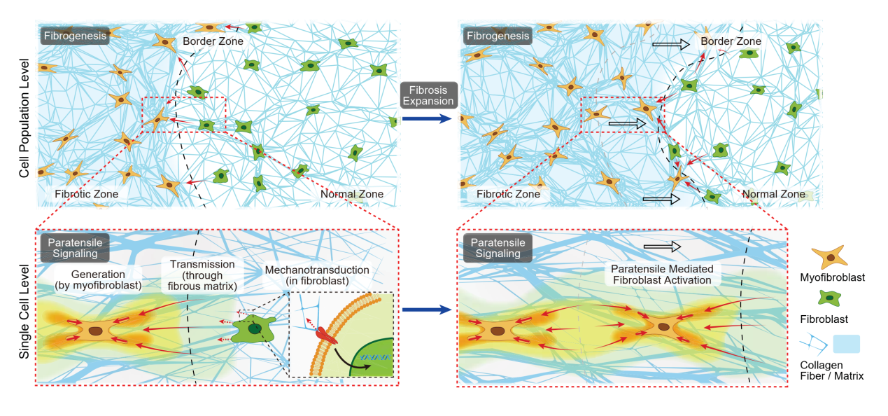 旁张力信号包含三个过程,一、力学信号的产生;二、力学信号在细胞外基质传递;三、周围细胞接受力学信号刺激作出响应。此过程介导了纤维化区域在组织内的扩张蔓延。