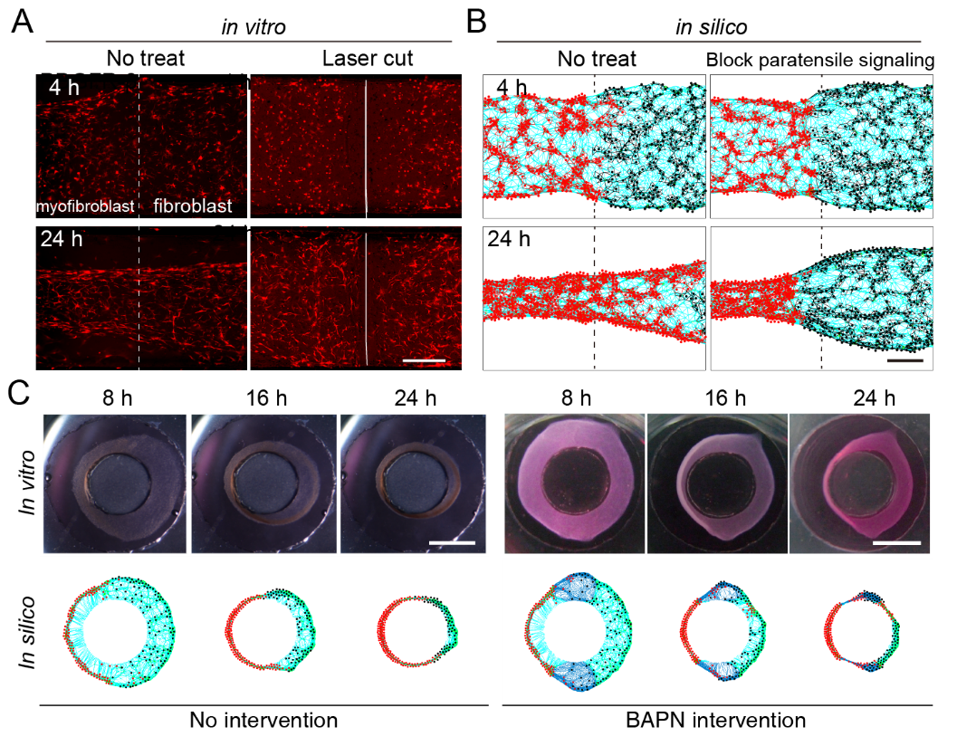 在纤维化蔓延界面体外(A)和数学模拟(B)仿生模型中,在未干预的情况下,纤维化区域呈现显著蔓延并伴随着成纤维细胞的激活。通过显微切割技术切断纤维化界面的胶原纤维阻断旁张力信号,纤维化蔓延趋势得到显著抑制。同样在模拟心脏心室壁的组织纤维化模型和数学模拟模型中(C),在未干预情况下均出现显著纤维化蔓延,但是经过小分子BAPN处理抑制胶原纤维重塑,纤维化区域的蔓延得到抑制。