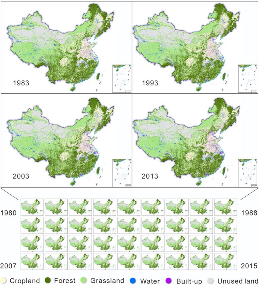 陆地资源卫星(Landsat)30米分辨率数据被广泛应用于长时间序列土地变化研究,但因其时空覆盖不全,难以被直接用于开展中国逐年土地利用/土地覆盖制图。在本研究中,俞乐课题组使用中分辨率(250米)成像光谱仪(MODIS)数据集和低分辨率(8千米)全球模拟与制图研究数据集(GIMMS),结合逐5年30米中国土地利用数据库(CLUD)和时间序列分析方法,得到1980-2015年逐年中国土地利用数据集(CLUD-A)。论文探索了加性季节和长期趋势突变检测算法(BFAST)在全类型土地利用/土地覆盖变化检测中的有效性,通过检测中低分辨率时间序列数据的断点,来补全CLUD数据中缺失年份的变化信息,变化精度达到75.61%。这套数据集展示了我国近40年以来农田、城市、森林、草地、水体等的时空动态过程,具备了与逐年统计数据相一致的更新频率。逐年数据集还能够减少单期、两期等“静态”土地利用/土地覆盖数据集作为陆面模型输入带来的模拟结果偏差。因此,CLUD-A可以为我国生态环境监测、模拟和政策评估等提供支持。