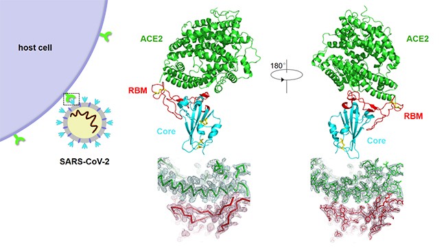 新型冠状病毒SARS-CoV-2刺突蛋白受体结合区RBD(core+RBM)与ACE2复合物晶体结构及作用界面电子密度图