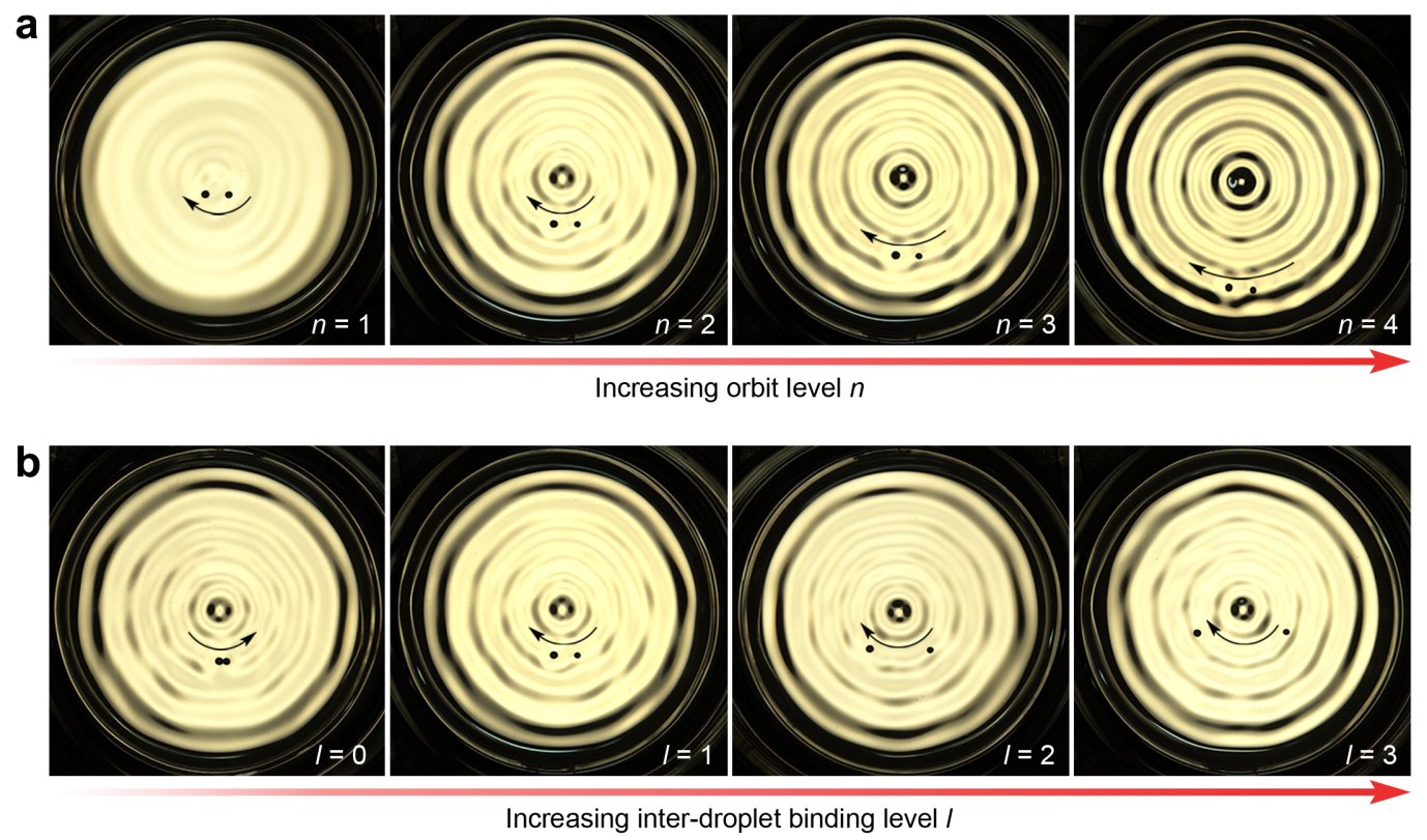 正如核外电子绕原子核旋转的轨道是量子化的一样,液态金属液池表面形成的环形全局导航波轨道也具有类似的量子化特征。因此,在其中追逐的液滴的轨迹是一系列不同直径的环形轨迹(图3a)。研究还发现,通过调整两个液滴之间不同的组合方式,可以实现液滴在轨追逐方向的改变(图3b)。这种复合导航波场导致的液滴的方向性旋转可以进一步与泡利不相容原理描述的原子轨道上电子的正向和反向自旋行为类比。