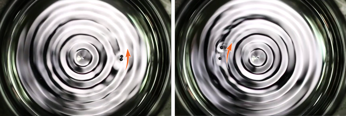 这些引人入胜的现象的背后是液滴与液池表面的导航波场之间的一系列微妙相互作用。从侧面观察会发现,这些在液面水平方向上旋转追逐的液滴同时在竖直方向上不停的弹跳。研究发现,如果两个液滴的大小不相同,他们弹跳的节奏就会不同步。较小的液滴在弹跳过程中总是先于较大的液滴抵达液面。而正是由于这一竖直方向弹跳的不同步引起了液滴水平方向的运动(图4)。