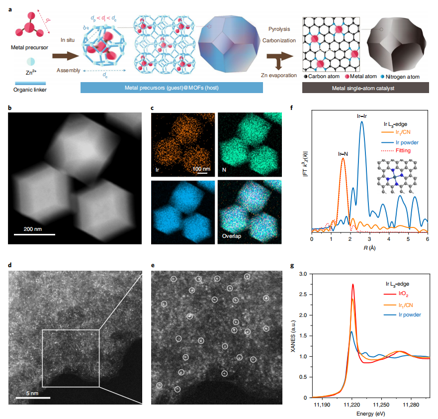 新材料的通用合成方法是挖掘其新性质的重要前提和基础。研究者发展了一种通用的主客体化学合成策略,用于合成多种氮掺杂碳负载的金属单原子位点催化剂(M1/ CN,M = Pt,Ir,Pd,Ru,Mo,Ga,Cu,Ni,Mn)。该方法基于主客体化学,在原位晶体生长的条件下,将金属前驱体封装在笼状的金属有机框架孔洞中,形成了金属前驱体在金属有机框架(ZIF)中的均匀分散的主客体结构,在随后的高温煅烧中,金属前驱体分解并被固载在ZIF衍生的碳氮基底上。