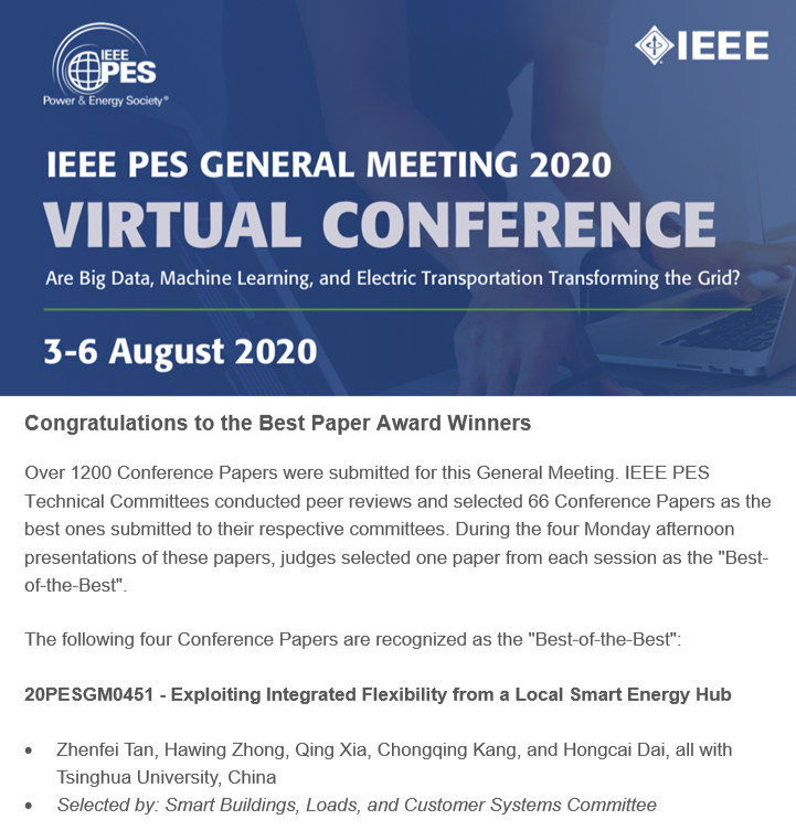 IEEE电力与能源学会年会是电力与能源领域的顶级国际会议,每年举办一次。此次会议共收录会议论文644篇,来自69个国家和地区的2200余名专家学者参加了此次会议。最佳论文奖经2轮评审选出:首先从会议录用论文中分四个技术领域评选出66篇最佳论文(Best Paper),评委再根据线上展示从每个技术领域评选一篇论文授予最佳论文奖(Best-of-the-Best)。本年度共4篇论文获该荣誉,本文是国内唯一获奖论文。