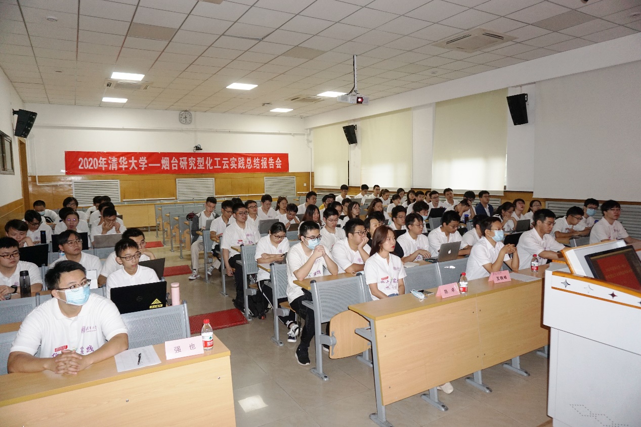 烟台市教育局局长蔡润圃、副局长宋守杰,教育总督学刘永涛,工信局副局长乔玉晶,课程组教师王亭杰、王运东、燕立唐、陈振出席报告会。化工系2017级本科生94人分4队(20个组)在上午和下午分别作课题研究总结报告,烟台会场企业相关领导、工程师和学生100余人,清华会场师生70余人、线上10余人参加总结报告会。企业负责人对报告作了点评,高度评价同学们的科学作风和报告质量。