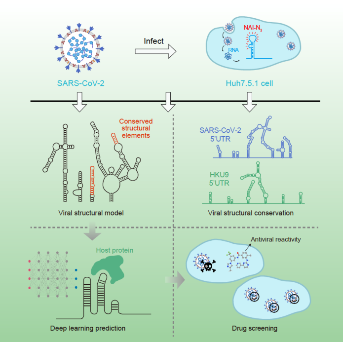 图1.解析新冠病毒体内RNA结构,并基于结构发现相关宿主因子,筛选潜在抗病毒重定位药物