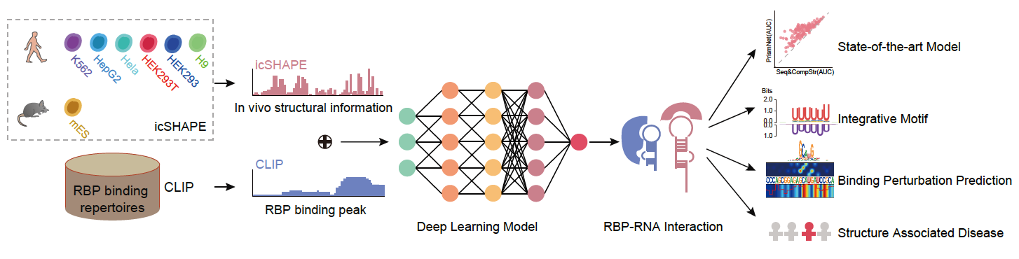 张强锋课题组还致力于开发新的人工智能方法来解决复杂的生物学问题。在一个与该新冠病毒RNA结构研究同时发表的工作中,该课题组通过整合对应的细胞内RNA结构信息和RBP结合信息,开发了一个可以准确预测RNA结合蛋白(RBP)的结合位点及其变化的深度神经网络PrismNet(图2)。RBP在转录、RNA代谢以及翻译过程中起重要的调控作用。CLIP实验技术作为RNA研究最重要的技术之一,可以解析RBP在整个转录组上的结合图谱,是系统理解一个RBP功能及其调控机制的基础。多年的科学研究积累了大约200个基于CLIP实验的RBP转录组结合图谱,是研究RNA调控的重要资源。PrismNet的一个重要应用价值在于大大扩充了这个资源。比如,对于任意一个RBP,只要在任意一个细胞背景下做了CLIP实验,PrismNet就可以通过构建准确的深度神经网络模型,把该RBP的结合信息外推到其他解析了RNA结构的细胞背景中。
