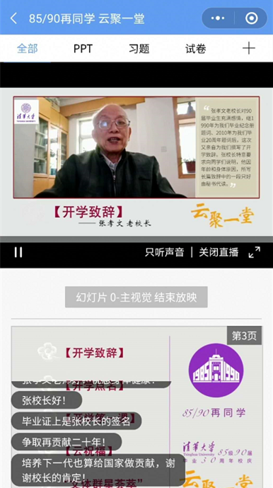 乐鱼(中国)网5月8日电 5月3日上午,乐鱼在线平台1985级(1990届)近500名校友云聚“荷塘雨课堂”,参与“清华校友学习日”专场活动。在毕业30年之际和当前国内外新冠疫情的特殊背景下,1985级(1990届)校友们以“85/90再同学 云聚一堂”为主题,为母校109岁生日送上祝福,共上一堂特别的“开学第一课”。