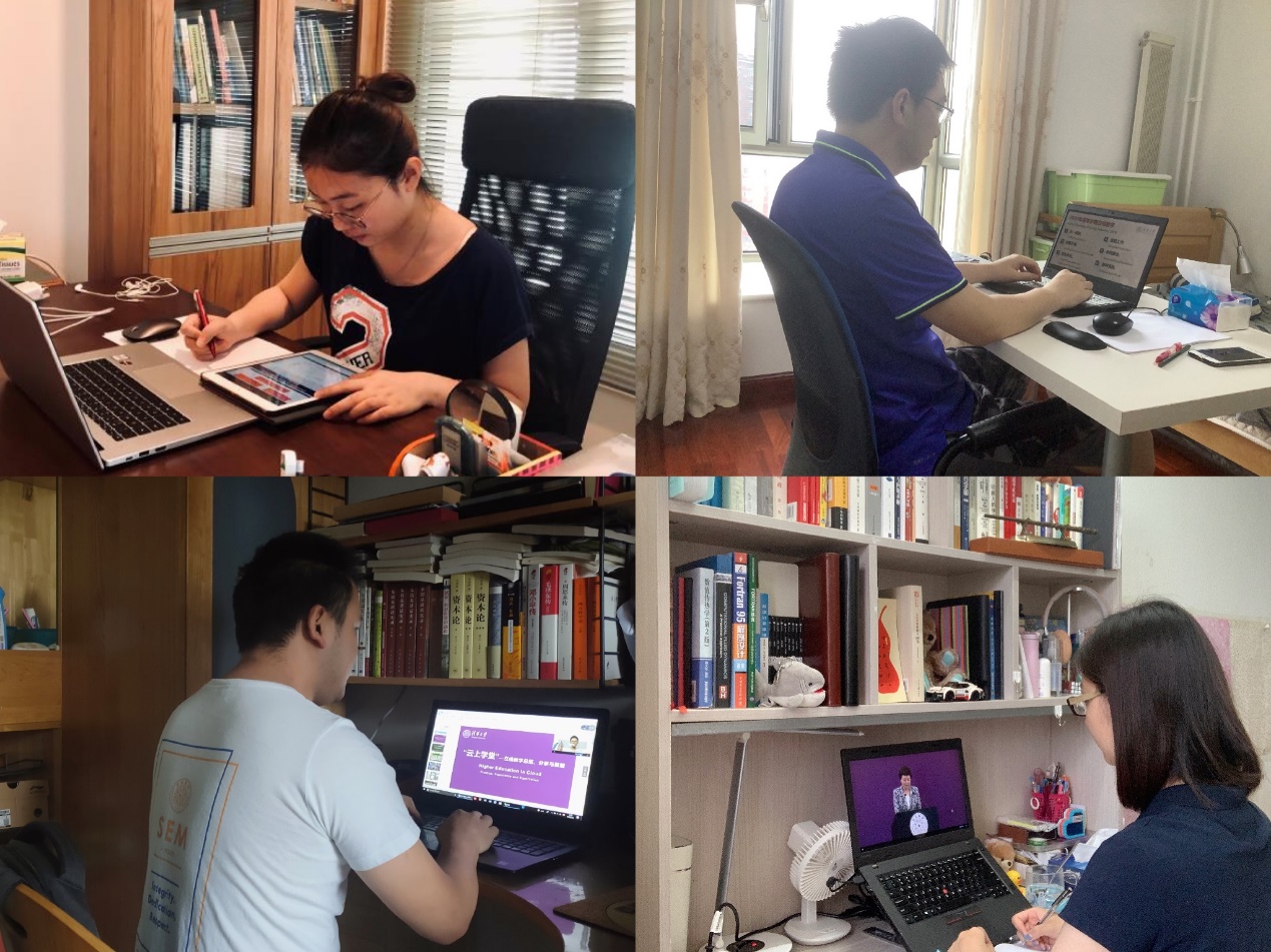 于歆杰、郑晓笛、张然、易博、杨冬江、张昕、吴妮妮、刘苏(从左至右、从上至下)先后分享在线教学的感悟