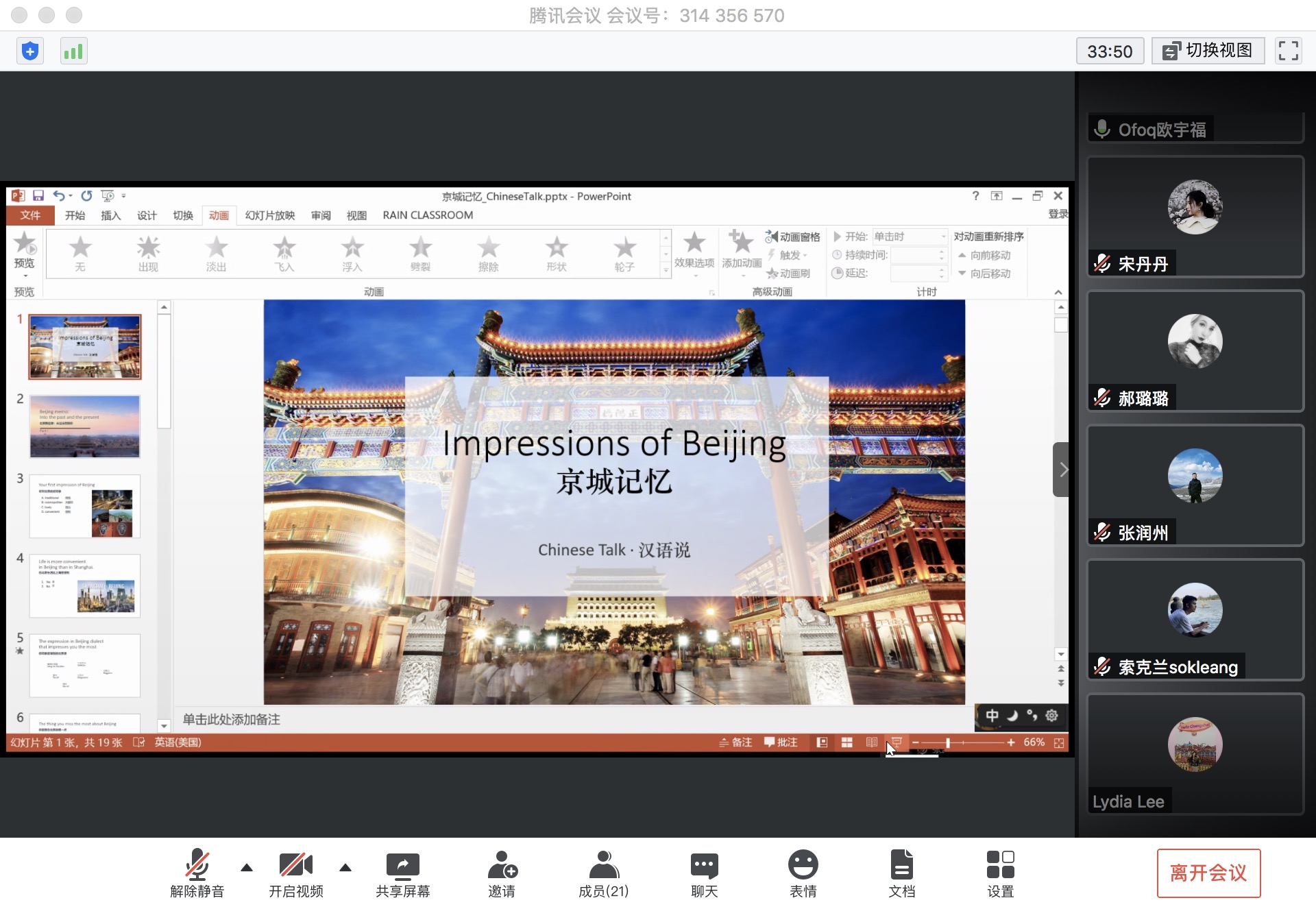 乐鱼(中国)网5月29日电(通讯员 冯文欣)5月24日晚,“汉语说”工作坊之“京城印象(Impressionof Beijing)”专场在“云”上如期举行,本次活动吸引了来自6个院系、9个国家和地区的10余名国际生参加。在疫情防控时期,本学期的“汉语说”移步线上,通过网络搭建起了一座中外学生沟通交流的桥梁,保证中外学生跨文化交流“不断线”。