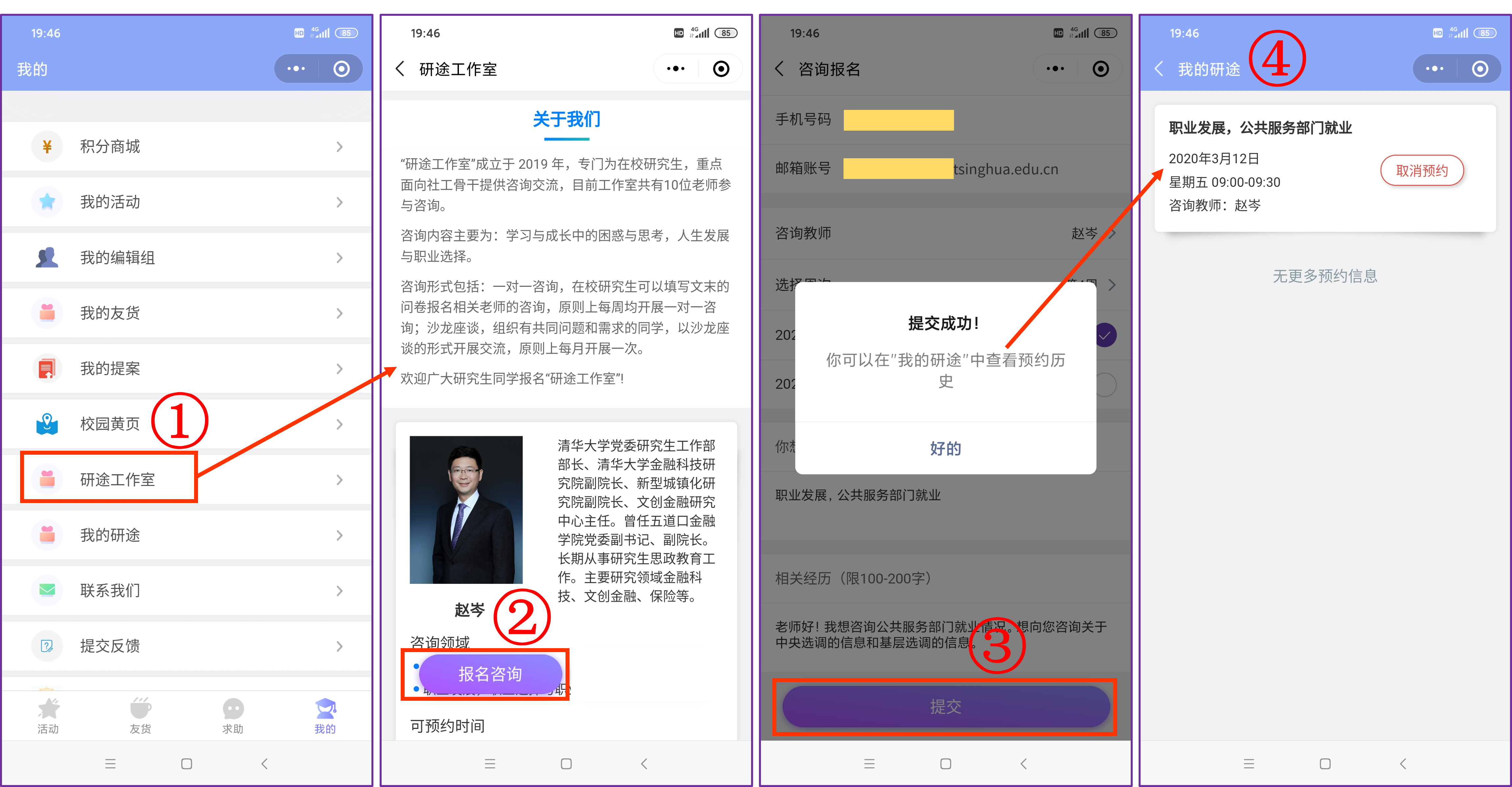 为了提高“研途工作室”的预约便捷程度,工作室持续畅通和简化预约流程,并做好预约环节的规范与记录。本学期“研途工作室”通过微信小程序“水木汇”预约,以进一步提高同学端预约的便捷性,并更精准地面向同学们收集咨询前的必备信息。