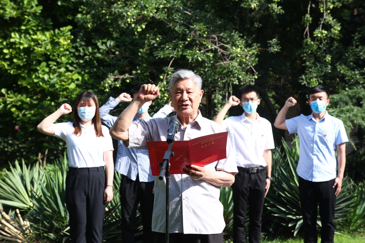 活动上,在组织部统战部联合党支部党员、学校老领导黄圣伦的带领下,全体党员面对鲜红的党旗一同重温了入党誓词。黄圣伦于1950年3月22日正式入党(时年16岁),当年考入乐鱼在线平台化工系,1953年担任首批学生政治辅导员,曾任化工系党委书记,校党委宣传部长、党委组织部长、党委副书记,至今已有整整70年党龄。